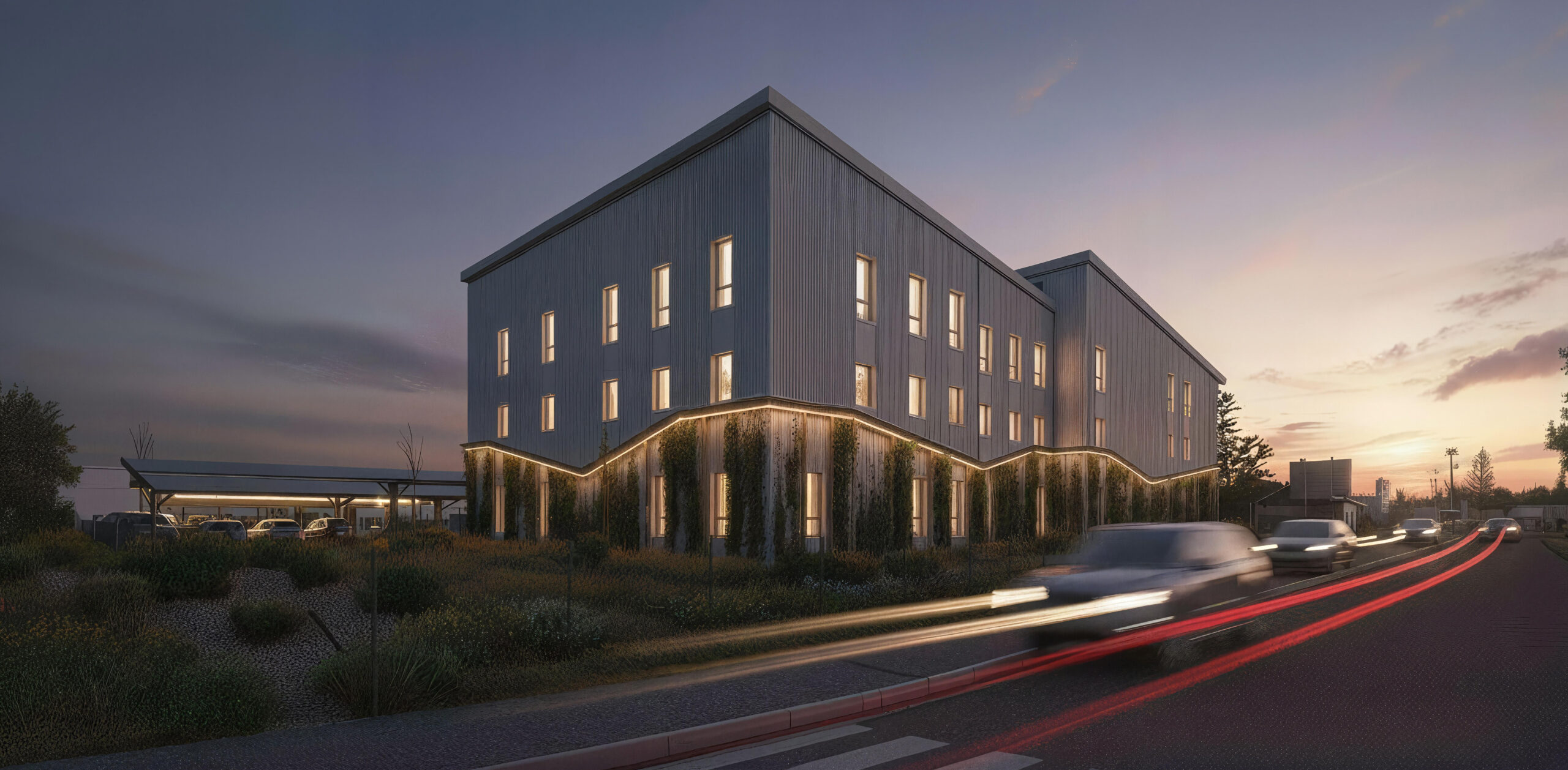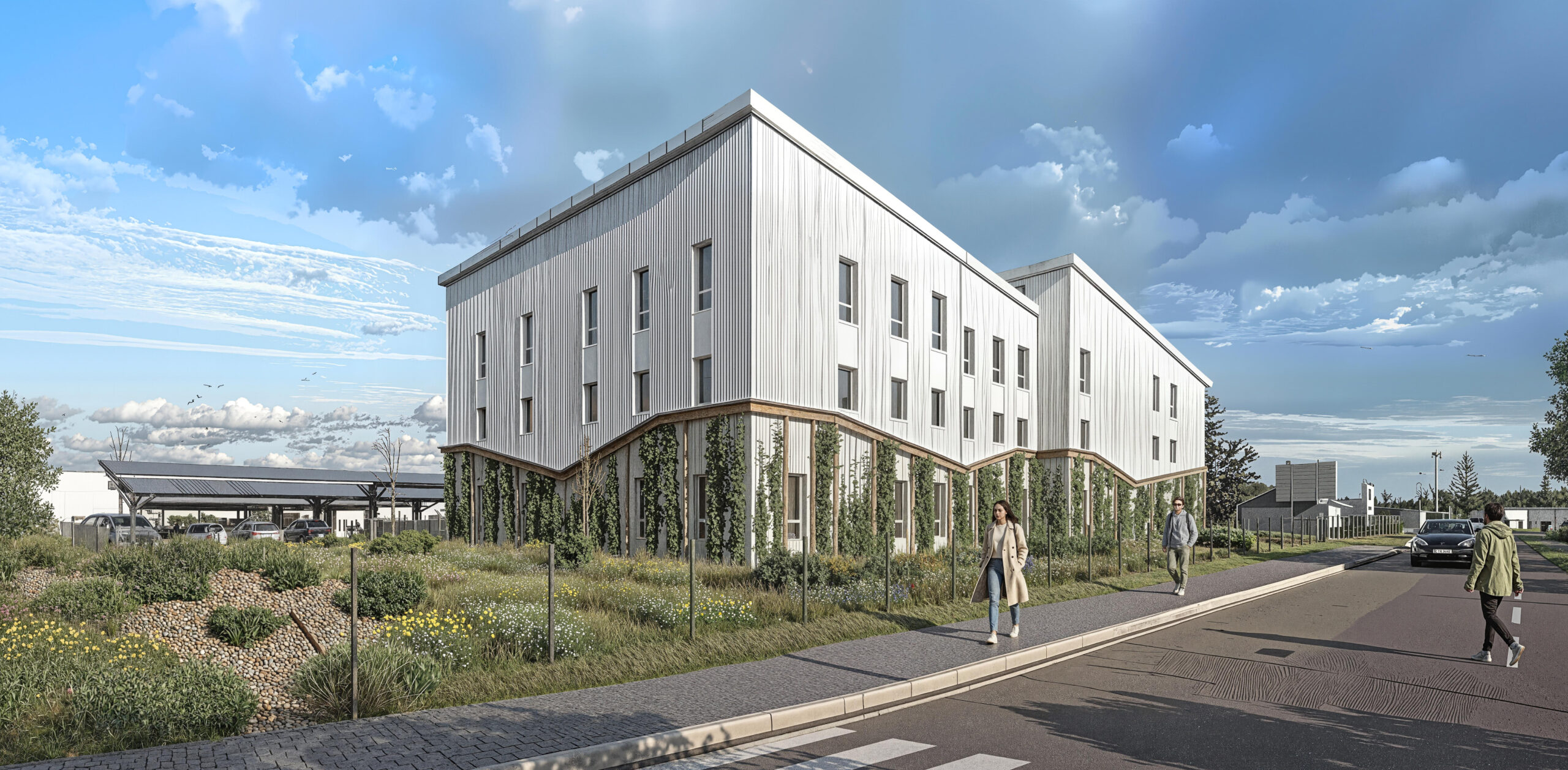 Des éléments de bardage bois viennent compléter l’ensemble pour renforcer ce renversement Nature / Industrie. L’écriture industrielle est également repensée ; les séquences de sheds sont ici développées en 3D pour optimiser les apports en lumière naturelle, avec de généreux éclairages zénithaux et des décalages en plan pour bénéficier aux différents niveaux. Le reste de la toiture est occupée par des panneaux photovoltaïques et minimiser l’impact environnemental.